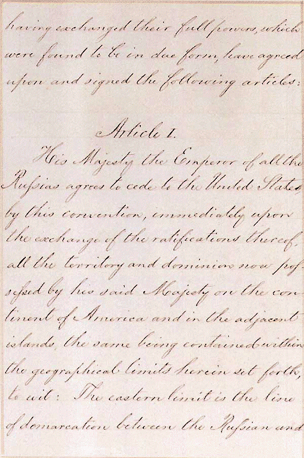 Presented below is a chronology of historical events derived from written records. Native Alaskan history prior to the arrival of Russians and Europeans was passed on almost exclusively through oral narratives and stories. These oral histories converge with archeology to suggest that Natives have lived and moved through Alaska for at least 10,000 years. The list of events below, however, primarily reflects the history of western settlers who entered Alaska less than 300 years ago. For more information about Alaska Natives, their history, and oral traditions, visit our Alaska Native page and try the links at the bottom. The following information was taken from The Blue Book, 1993-1994 the Fairbanks Daily News-Miner, Alaska Almanac, Alaska Economic Trends, 1999, and the Anchorage Daily News. Russian treaty for the sale of Alaska. English version of the treaty for the sale of Alaska